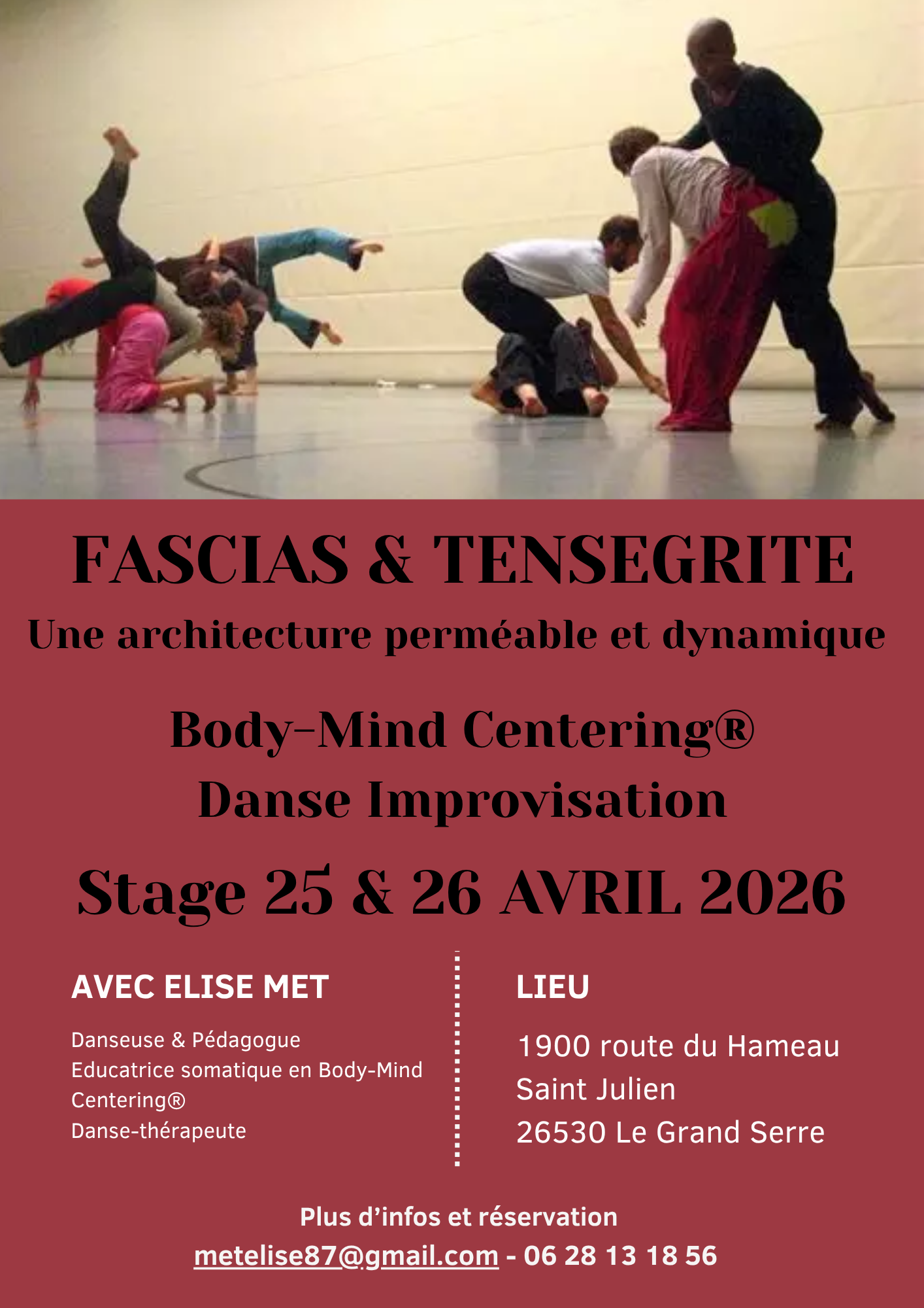 STAGE 26 & 26 AVRIL 2026 au Grand-Serre (Drôme) Fascias et tenségrité Une architecture perméable, souple et dynamique Dialogues somatiques Poétique du corps en mouvement Body-Mind Centering® & Danse Improvisation Toutes les infos ICI : STAGE 25.26 avril 2026 Fascias & Tenségrité - Gd-Serre